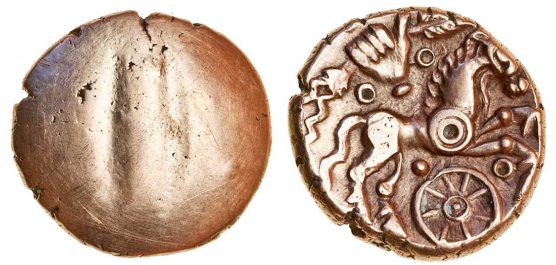 Celtic, Cantii, uninscribed coinage, (c.60-20? BC), gold Stater, 5.48g, 'Thumbs Up' type, blank die with banding, rev. horse right, hand holding corn ear and annulets above, wheel below with pellet and annulet (ABC 186; VA 1507; S.35), light contact marks and with a little weakness to high points, however, a remarkably well struck and full piece, certainly one of the finest of the thirteen known; a premium example, nearly extremely fine, extremely rare