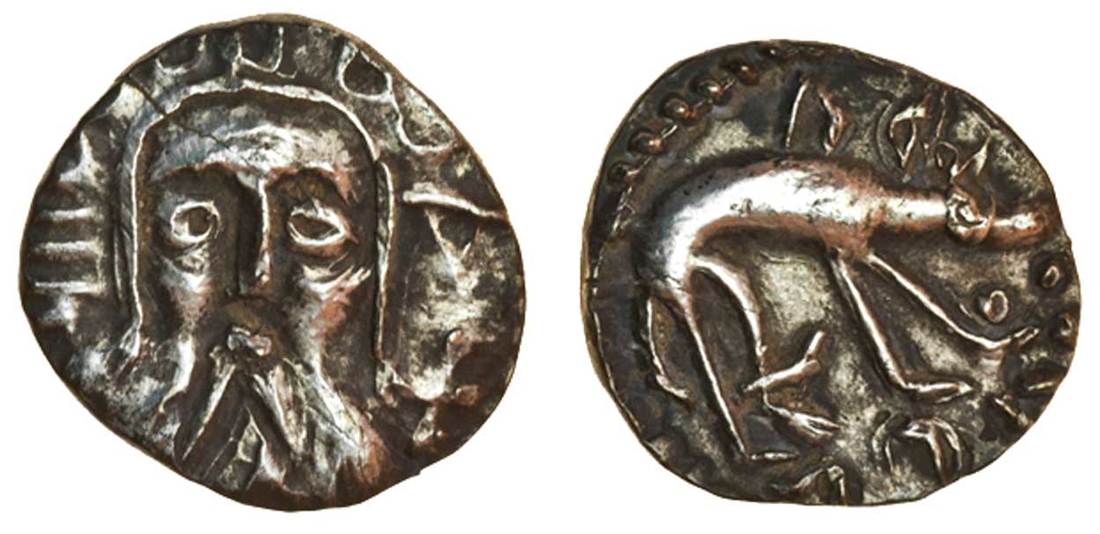 Anglo Saxon, Sceatta, 1.25g, Primary phase, c.680-c.710, series Z, facing head of Wodan or Christ with forked beard, pseudo-legend around, rev. hound right, pseudo-legend around (Abramson Th 8, Gp 102, Var 60, p.206; Metcalf 140-2; N.145; S.782), fine crack to centre of bust, slightly irregular flan, this piece very well struck with much detail to the facial features, as struck and extremely fine, very rare