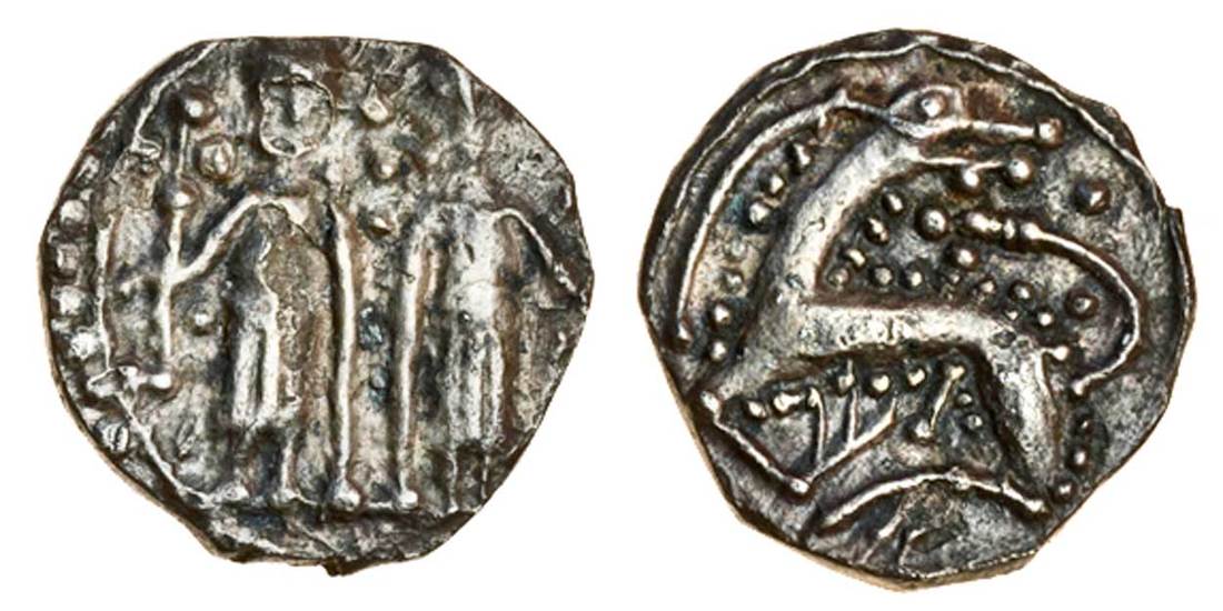 Anglo Saxon, Sceatta, 0.97g, Secondary phase, c.710-c.760, series N, type 41b, two facing figures wearing tunics, each holding long cross pommée on one side and also sharing a long cross pommée between them, groundline below, rev. crested monster left looking back, pellets surrounding (Abramson Th 5, Gp 52, Var 40, p.142; N.98 var.; S.806), some corrosion to obverse, light pitting to beast, this reverse particularly sharp and pleasing, nearly very fine/extremely fine