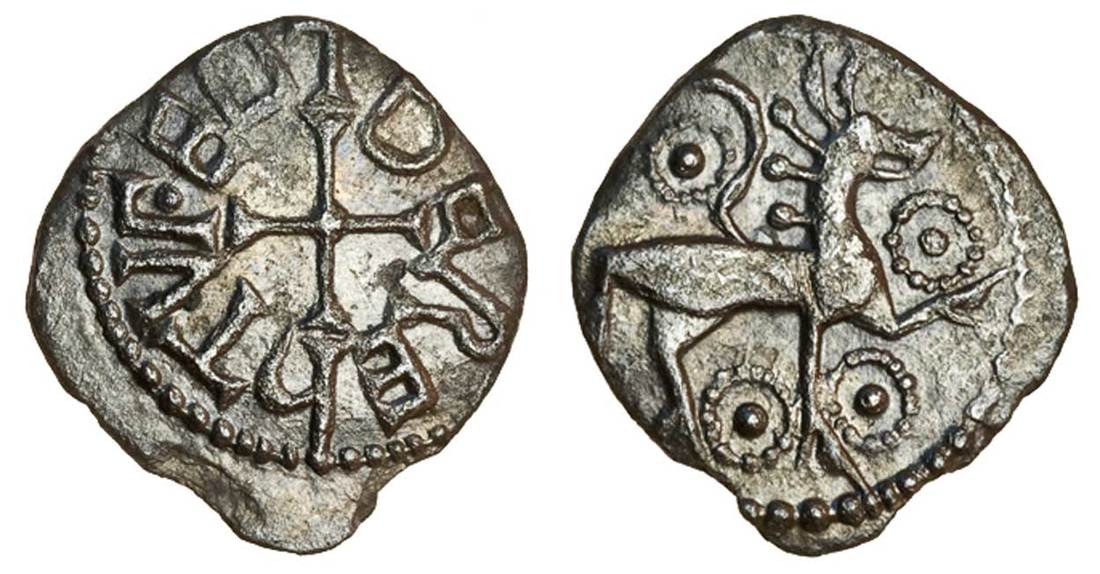 (x) Northumbria, Eadberht (737-58), Sceatta, 0.91g, large cross, eotderehtvf around, no inner circle, rev. stylized stag right, pelleted bosses around (N.178; S.847), porous metal and this flan irregular, a good strike and with a light silvery tone, good very fine