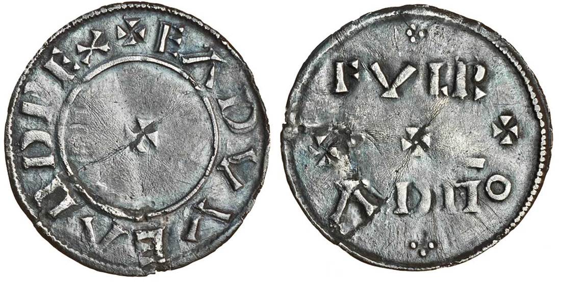 Wessex, Edward the Elder (899-924), Penny, 1.45g, Two line type (HT1), (BMC II), Fulrad, cross pattée within inner circle, +eadvveard rex around, rev. fvlr / ad m-o, divided by three cross pattée, trefoils above and below (N.649; S.1087), a field find, once straightened with stress mark, also a fragment fixed back on between 6-8 o'clock, fine lines from old cleaning, centred, full, and legible, very fine