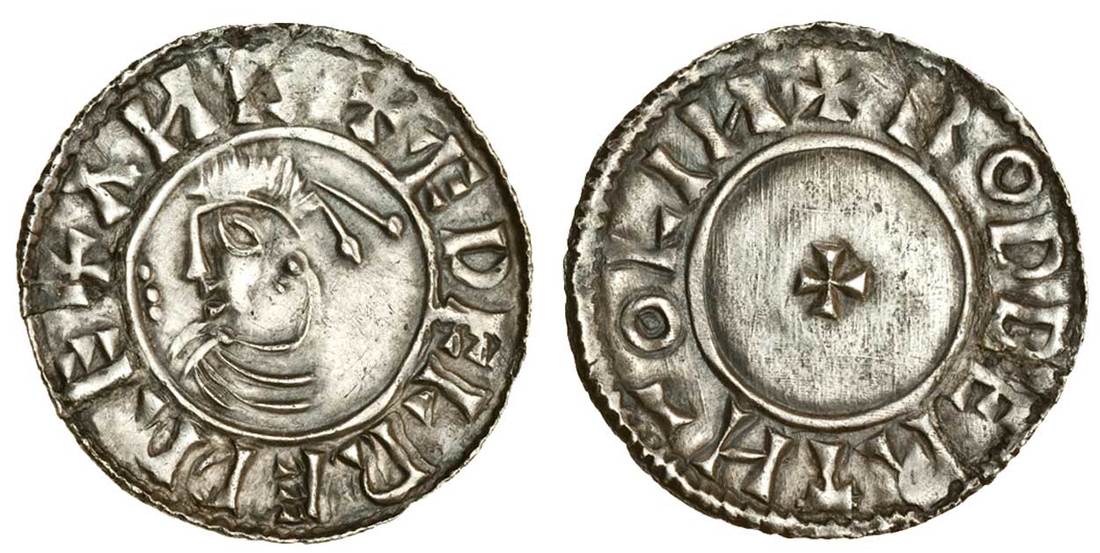 Aethelred II (978-1016), Penny, 1.38g, First small cross type, Lincoln, Rodbert, crude 'Lincoln' style diademed bust left, line of three pellets before, rev. +rodbert m-o lin, cross pattée within inner circle (SCBI 27 Lincolnshire, No.24 - same dies; N.764; S.1143), small areas of weaker strike in legends, portion of flan from 9-12 o'clock reattached, otherwise a most pleasing piece, full and round, some superb detail on this, nearly extremely fine, First small cross an extremely rare type in Aethelred II