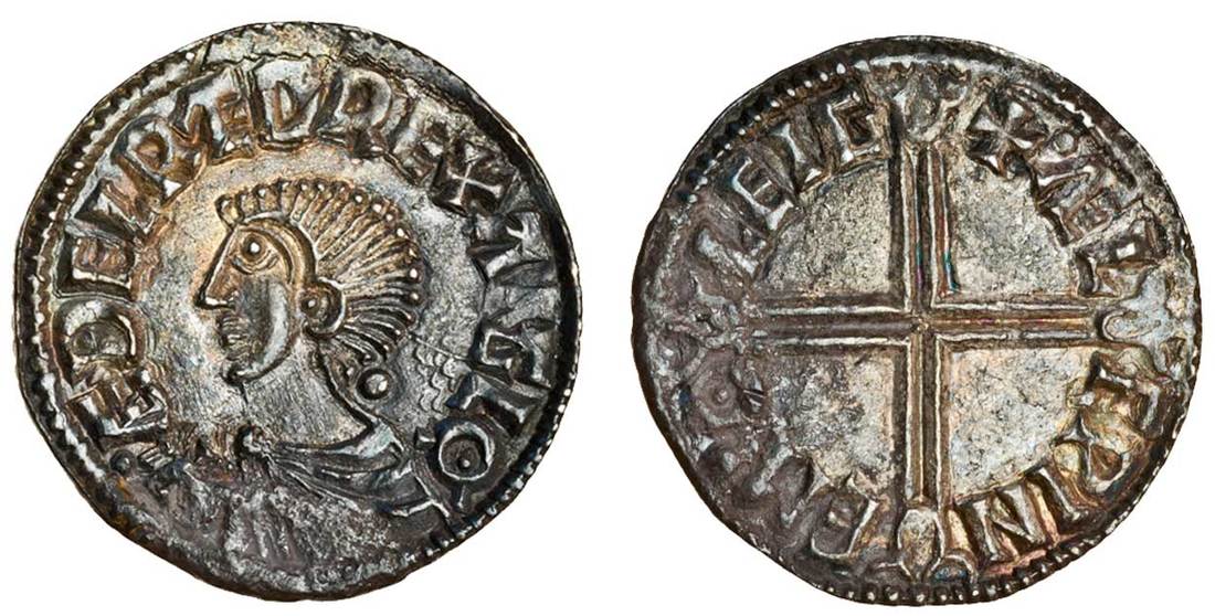 Aethelred II (978-1016), Penny, 1.70g, Long cross type, Cambridge, Aelfwine, bare headed bust left, rev, +aelfpine m.o leig, voided long cross each arm terminating in three crescents (N.774; S.1151), corresponding deposit beneath bust, portion of flan with a darker tone, otherwise a superb piece and a strike of the highest quality, lustrous and toned, extremely fine