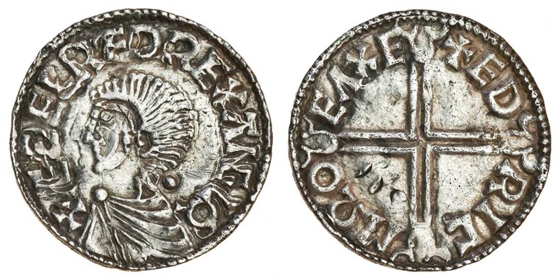 Aethelred II (978-1016), Penny, 1.68g, Long cross type, Exeter, Edric, bare headed bust left, rev, +edric mo eaxe, voided long cross each arm terminating in three crescents (N.774; S.1151), double striking to obverse, surfaces with some very light pitting and conatact marks, otherwise full and centred, tidy reverse, good very fine