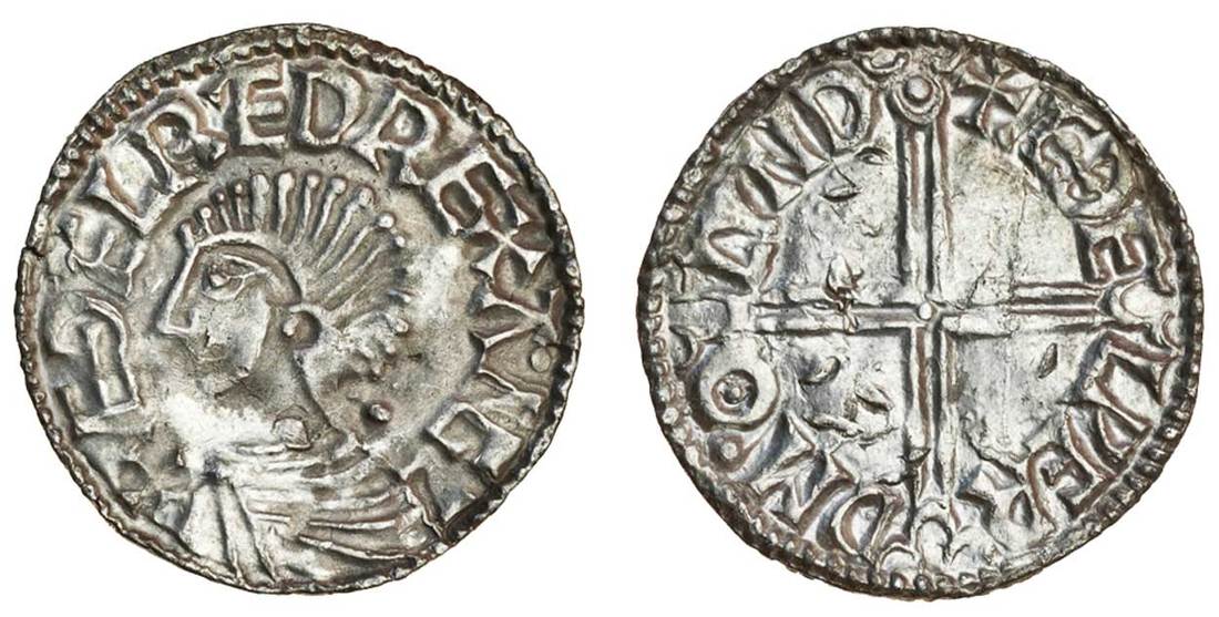 Aethelred II (978-1016), Penny, 1.34g, Long cross type, London, Aethelweard, bare headed bust left, rev, +eÐelperd m.o lvnd, voided long cross each arm terminating in three crescents (N.774; S.1151), pecks and some contact marks, line of delamination to reverse, good quality silver, full legends, good very fine