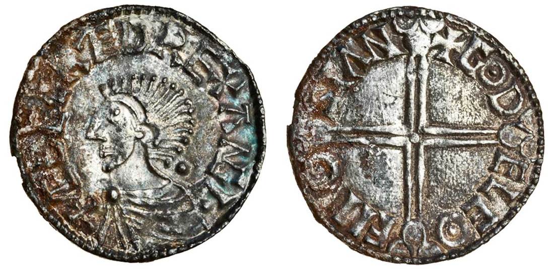 Aethelred II (978-1016), Penny, 1.36g, Long cross type, Stamford, Godleof, bare headed bust left, rev, +godeleof m.o stan, voided long cross each arm terminating in three crescents (N.774; S.1151), corresponding rusty deposits around 3 o'clock, some horn silver on other surfaces, deep tone, good strike on this, good very fine
