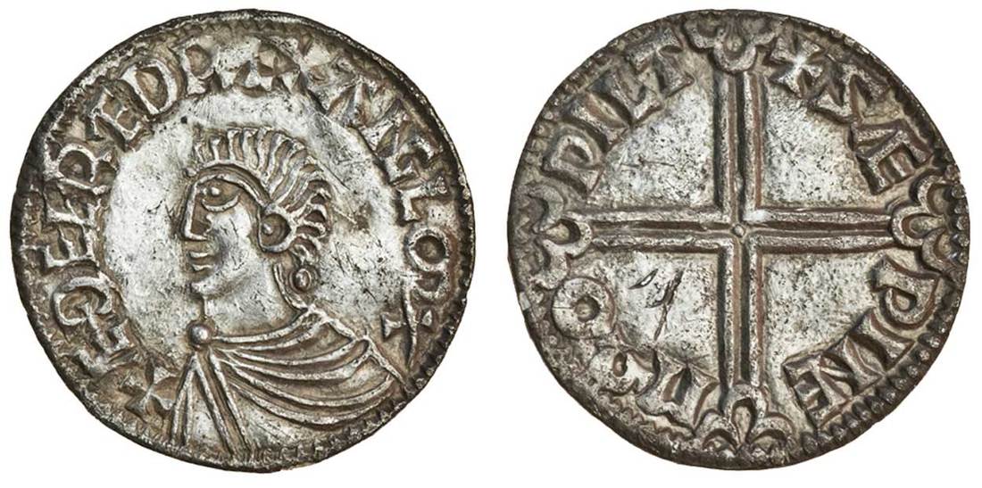 Aethelred II (978-1016), Penny, 1.59g, Long cross type, Wilton, Saewine, bare headed bust left, rev, +saepine mo pilt, voided long cross each arm terminating in three crescents (N.774; S.1151), pecks and with some contact marks, scratch behind bust, pleasingly full and very tidy, a crisp strike on this, most pleasing, nearly extremely fine