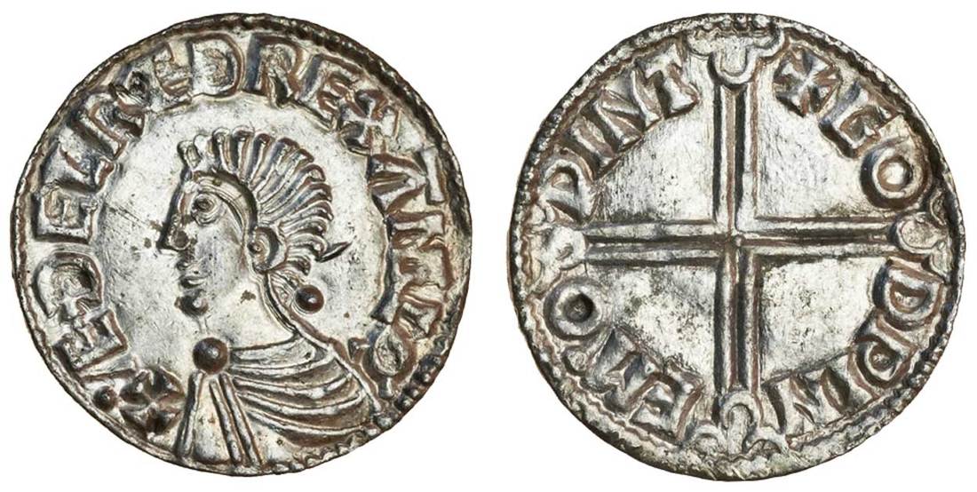 Aethelred II (978-1016), Penny, 1.73g, Long cross type, Winchester, Godwine, bare headed bust left, rev, +godpine m.o pint, voided long cross each arm terminating in three crescents (N.774; S.1151), peck behind bust and with some light contact marks under magnification, generally a superb and minty piece, fine silver, neat and well struck, as struck and extremely fine