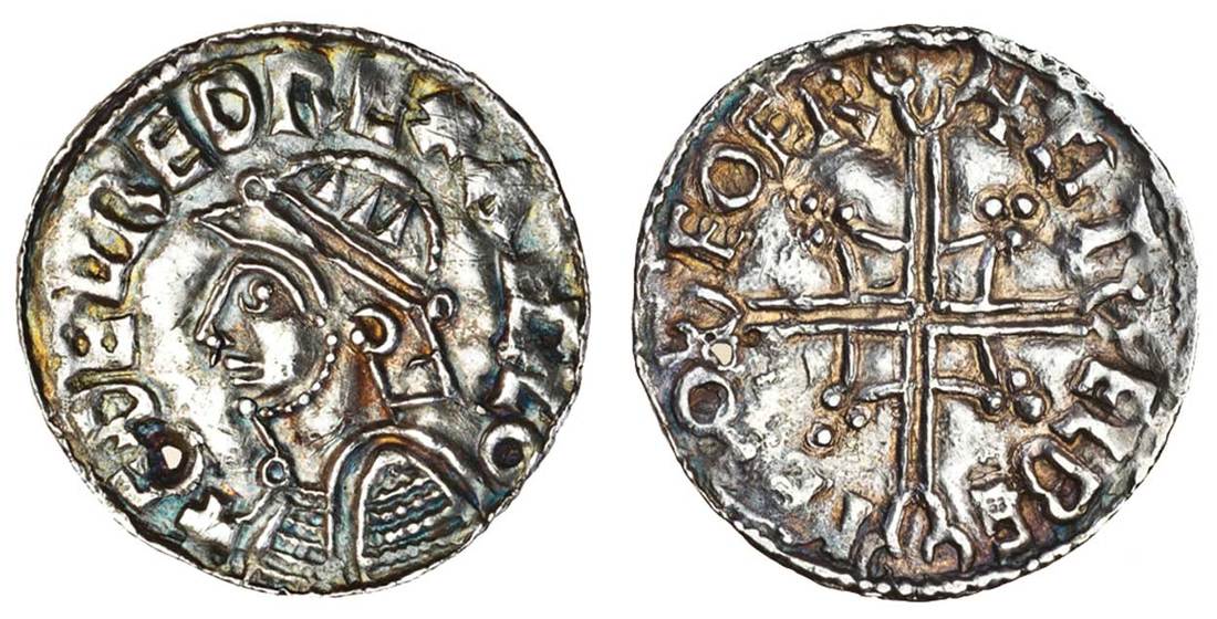 (x) Aethelred II (978-1016), Penny, 1.39g, Helmet type, York, Cetelborn, edelred rex anglo, helmeted bust left, rev. citelbe mo eofr, (N.775; S.1152), pierced at beginning of obverse legend, otherwise very fine