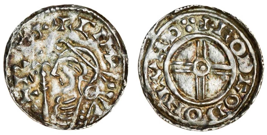Cnut (1016-35), Penny, 1.01g, Short cross type, London, God, diademed bust left, pellet-tipped sceptre before, rev. +godgod on lvnd:., voided short cross arms extending from central annulet (N.790; S.1159), peck, a little central weakness, very slight crease through flan, toned, perfectly centred with excess flan, presentable, very fine
