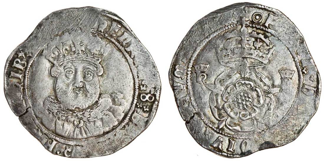 (x) Henry VIII (1509-47), third coinage, Testoon, 8.09g, m.m. unclear on obverse, pellet in anulet on reverse, henric 8 (N.1841; S.2365), mis-shaped flan and flat in legends, some double striking but a good portrait, very fine