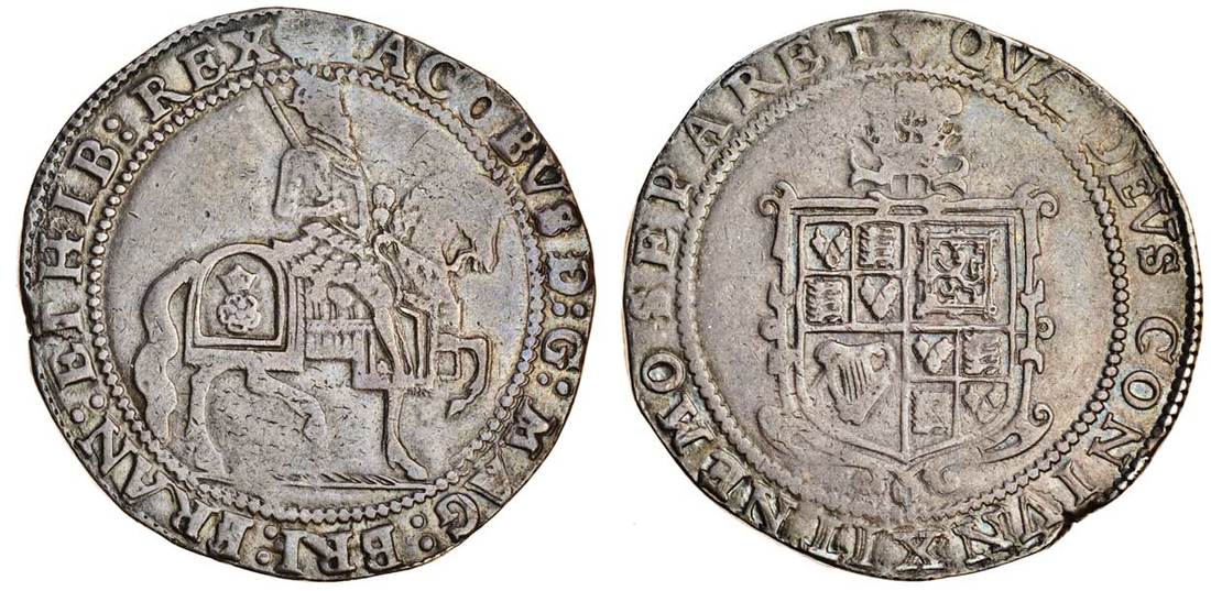 (x) James I (1603-25), third coinage 1619-25, Crown, 29.72g, m.m. trefoil over lis, king on horseback right, rev. plume over square topped shield (N.2121; S.2665), nearly very fine