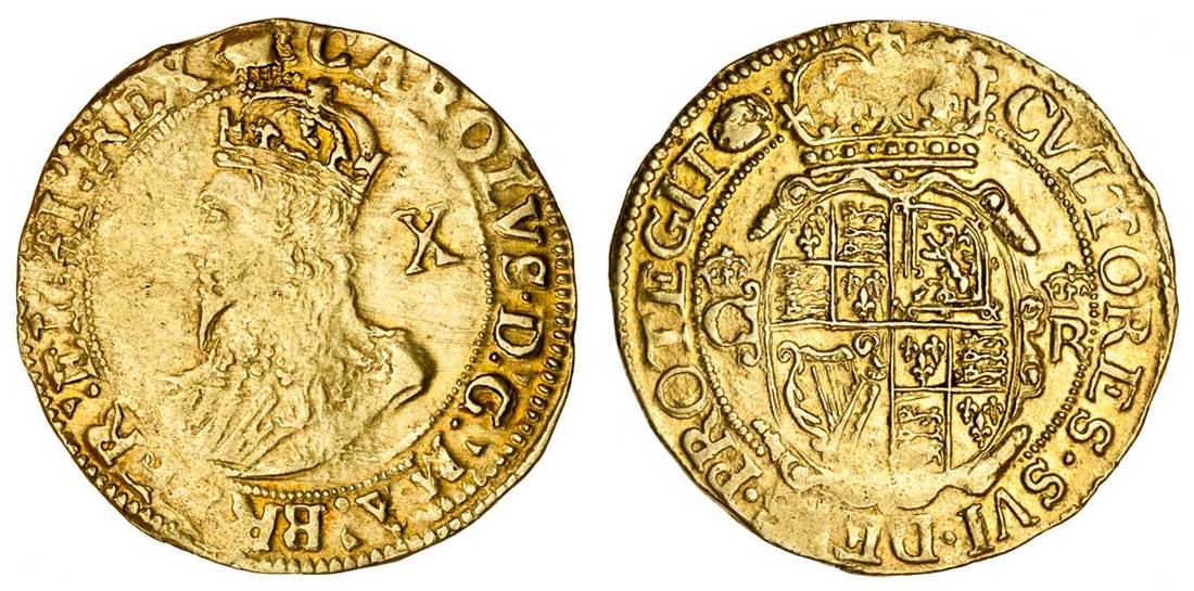 Charles I (1625-49), Double Crown, 4.46g, m.m. tun over portcullis / tun over harp (?), crowned bust left, rev. crowned oval shield dividing crowned c-r (N.2168; S.2703), very fine