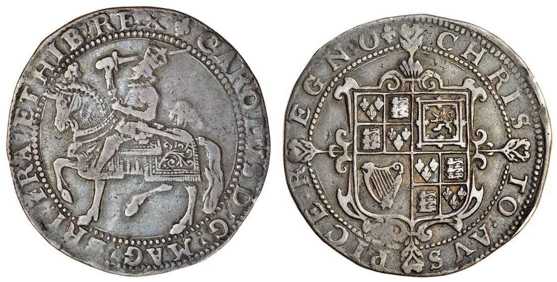 (x) Charles I (1625-49), Crown, 29.67g, m.m. lis, king on horseback left, horse caparisoned with plume on head and crupper, rev. square topped shield over long cross fourcheé (N.2190; S.2753), nearly very fine, old tone