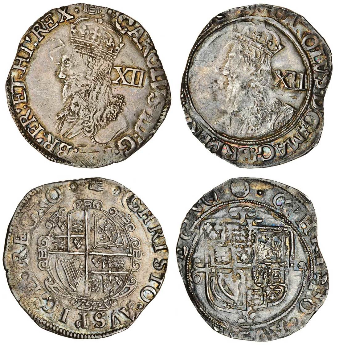 (x) Charles I (1625-49), Shillings (2), 5.77g, 5.86g, m.m. tun, large crude bust, no inner circle,rev. round shield (S.2792), and m.m. triangle in circle, Briot's bust, rev. square topped shield (S.2799), very fine, the second an irregular shaped flan (2)