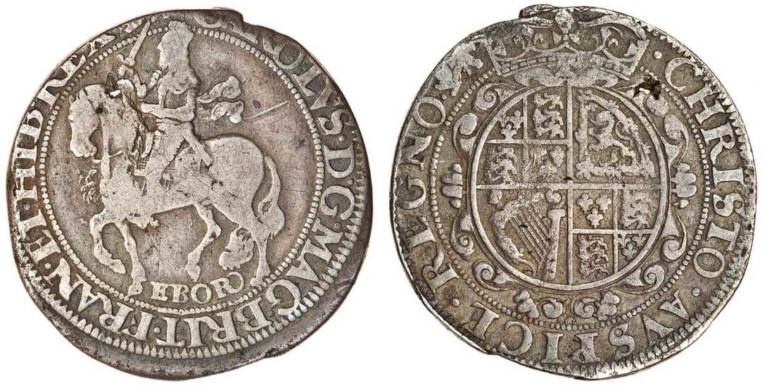 (x) Charles I (1625-49), York, m.m. lion, Halfcrown, 14.05g, king on horseback left, horse's tail shows between legs, ebor below, rev. crowned oval shield with lion skin garniture (N.2315; S.2869), flaw on horse's head resulting in small hole, fine
