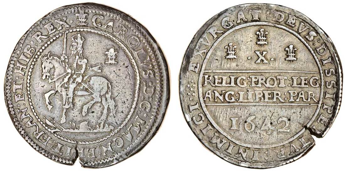 (x) Charels I (1625-49), Oxford, Half-Pound, 59.05g 1642, m.m. plume/-, king on horseback left, rev. Declaration, three Oxford plumes above, date below (Brooker 868; N.2404; S.2945), edge split through r of brit, very fine with old tone