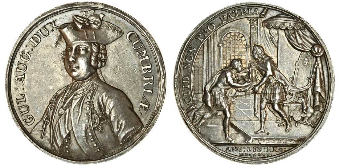 (x) George II (1727-60), the Duke of Cumberland returns to London 1746, silver medal by A and I Kirk, bust of Cumberland three-quarters left, rev. the King recieves from the Duke mural crowns and a palm branch, 42mm. (MI ii, 608, 268; Woolf 54:1b), good very fine
