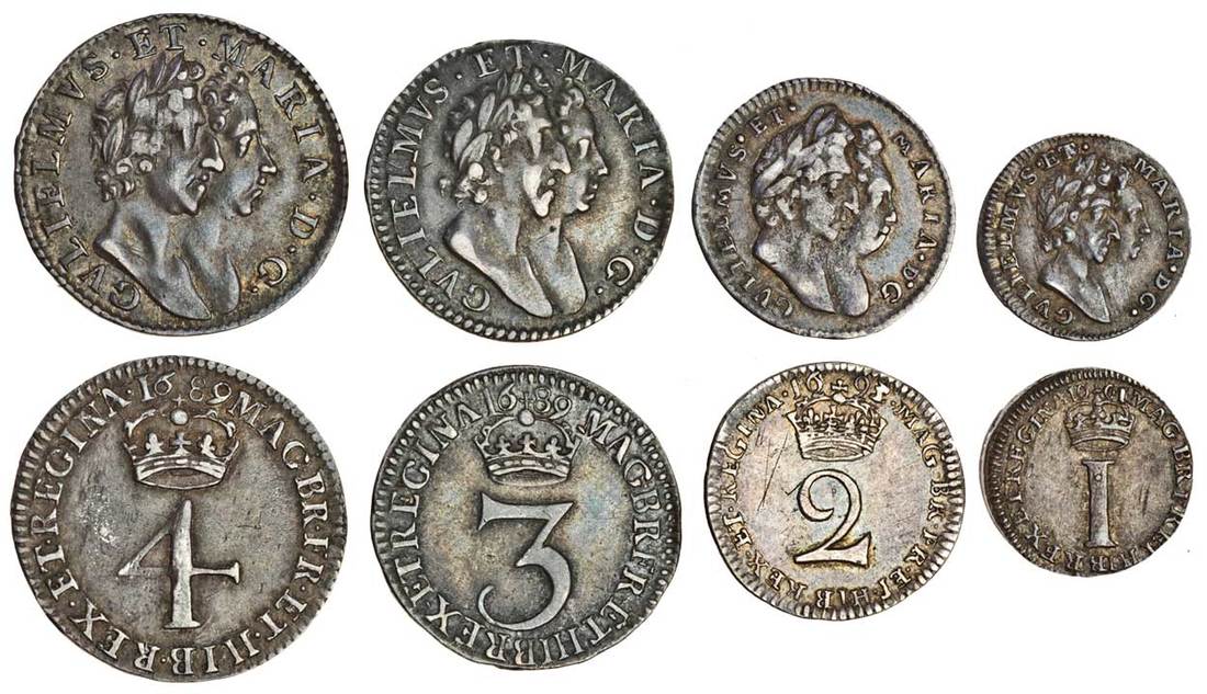 (x) William and Mary (1688-94), Maundy coins (5), Fourpence, 1689, 1692 over 1, Threepence, 1689, Twopence, 1693, Penny, 1691 (S.3439, 3440, 3441, 3443, 3445), second with metal loss at edge between 2 and 3 o'clock, otherwise average very fine (5)