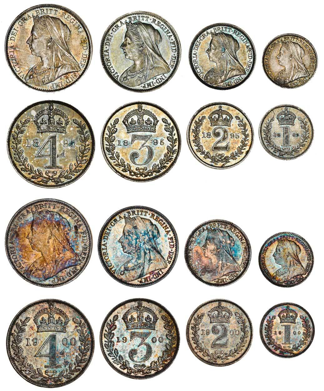 Victoria (1837-1901), Maundy Sets (2), 1895, 1900, veiled head, rev. value (S.3943), extremely fine, lustrous, the 1900 toned, the 1900 set in modern case (8)