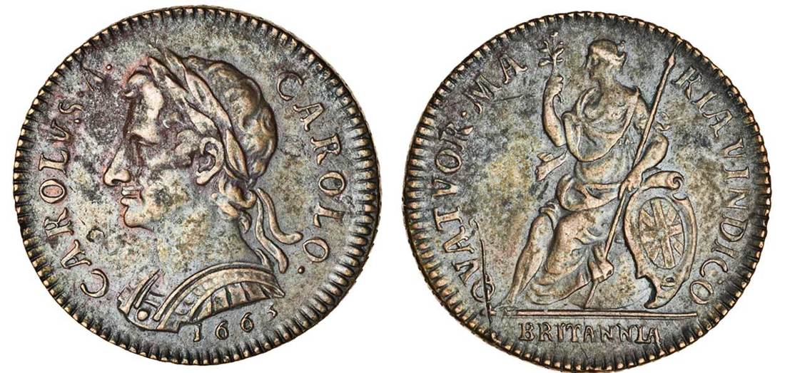 (x) Charles II (1660-85), pattern Farthing, 1665, laureate and cuirassed bust left, date below, rev. Britannia seated left, edge straight grained (Peck 409), scratch on the reverse, very fine