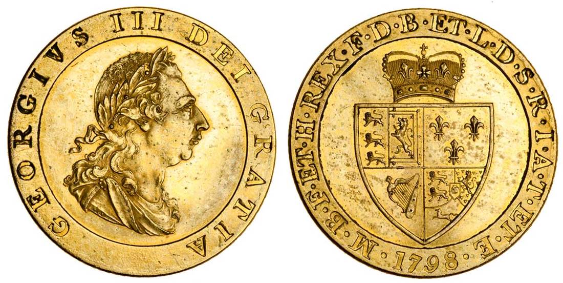 George III (1760-1820), pattern gilt Guinea, 1798, by C H Küchler, laureate and draped bust right, rev. inverse die axis, crowned spade shaped shield, edge with scroll 'vandyke' pattern (Montagu 676; Selig 1137), the gilt surfaces slightly cloudy, extremely fine, rare