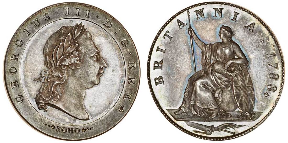 George III (1760-1820), silver pattern Halfpenny, 1788, laureate head right, rev. Britannia, seated left, date in legend, rudder and palm branch below, plain edge (cf.BMC 1061), light grey tone, slight cabinet friction on highpoints, brilliant uncirculated, rare