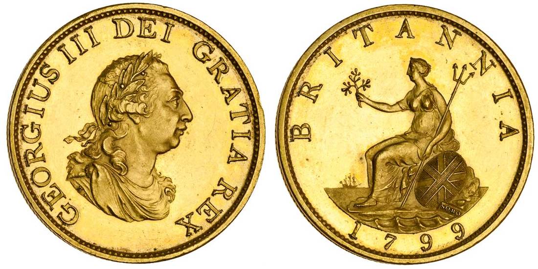 George III (1760-1820), gilt pattern Halfpenny, 1799 (late Soho), laureate and draped bust right, rev. inverted die axis, Britannia seated left, edge centre grained (Peck 1243), extremely fine