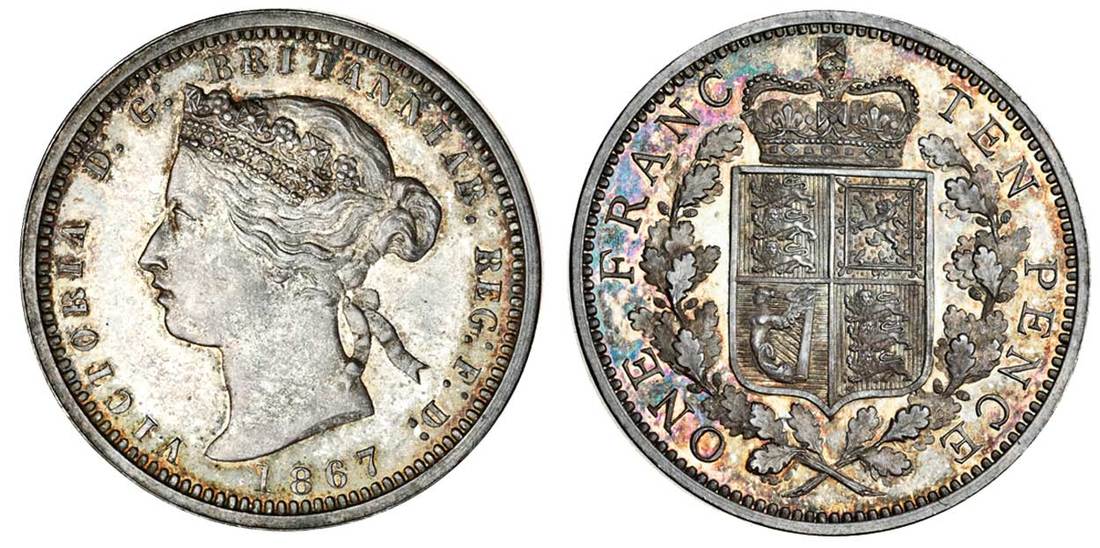 Victoria (1837-1901), silver pattern Ten Pence, 1867, by L C Wyon, coronetted head left, rev. struck en médaille, one franc ten pence, crowned shield, plain edge (ESC 1476 - R3), lustre old grey tone, cabinet friction, uncirculated, very rare
