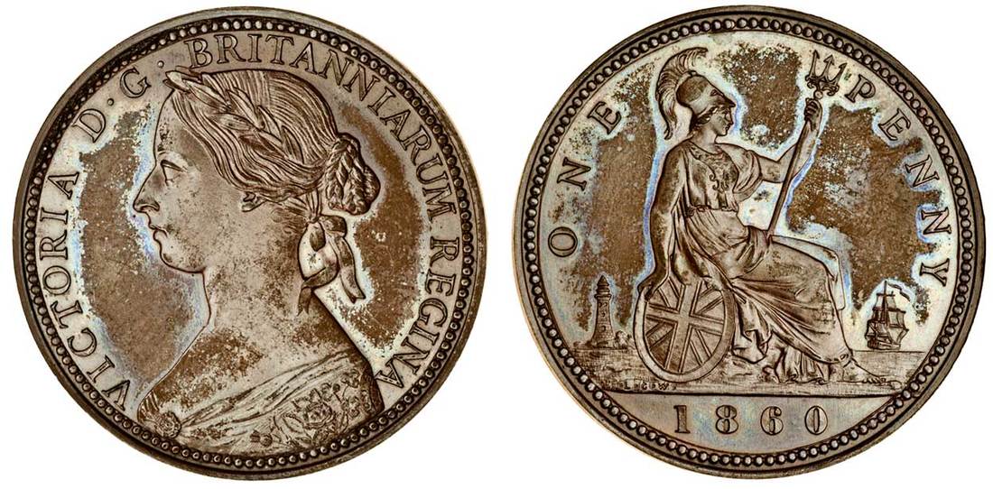 Victoria (1837-1901), bronzed pattern Penny, 1860, laureate and draped bust left, rev. struck en médaille, Britannia seated right, date below, edge plain (Peck 2045), extremely fine, extremely rare