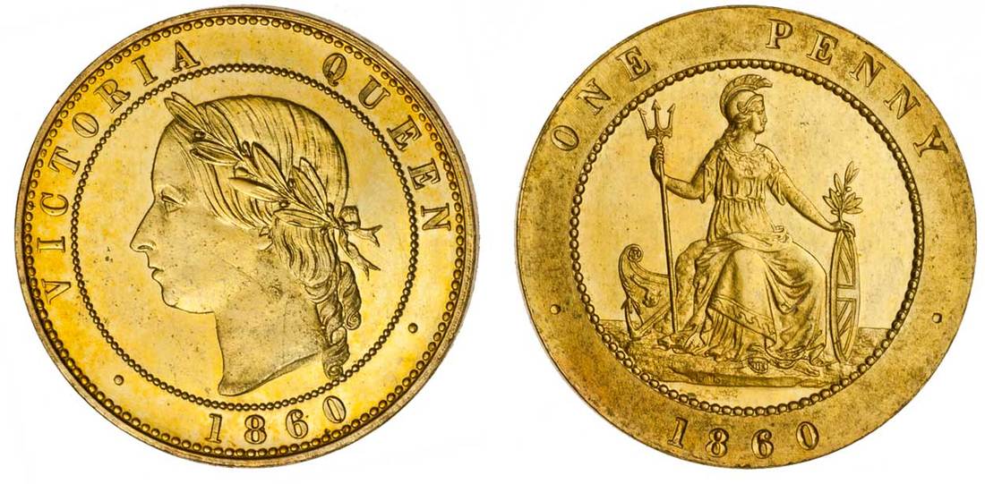 Victoria (1837-1901), gilt restrike pattern Penny, 1860, laureate head left, date below, rev.struck en médaille, Britannia seated facing, head turned to right, edge plain (Peck 2105), from rusty dies, a scratch on the obverse, good very fine