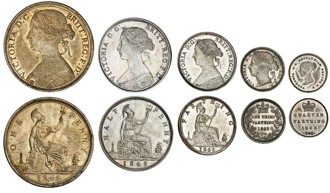 Victoria (1837-1901), a set of five pattern copper nickel 'experimental' coins, 1868, Penny, Halfpenny, Farthing, Third-Farthing and Quarter-Farthing, all plain edge proofs (Peck 1684, 1794, 1883, 1930, 1615), uncirculated, a very rare set (5)