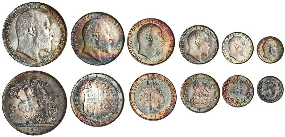 Edward VII (1901-10), set of silver coins, 1902, Crown, Halfcrown, Florin, Shilling, Sixpence, Threepence (S.3978, 3979, 3980, 3981, 3982, 3983, 3984), about uncirculated with pleasing irridenscent tone (6)