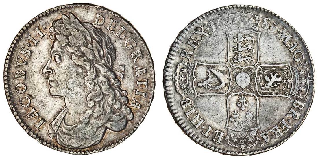 (x) James II (1685-88), Halfcrown, 1685 primo, laureate and draped bust left, rev. four crowned shields cruciform (ESC 493; S.3408), very fine