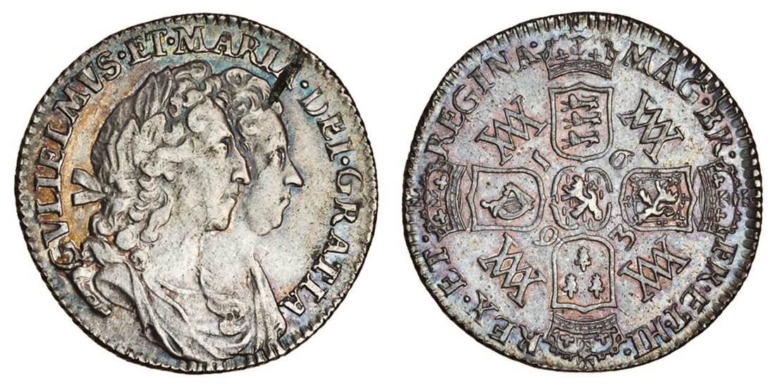 (x) William and Mary (1688-94), Sixpence, 1693, conjoined busts right, rev. four crowned shields cruciform (ESC 1529; S.3438), small metal flaw on a of maria, cleaned, good very fine