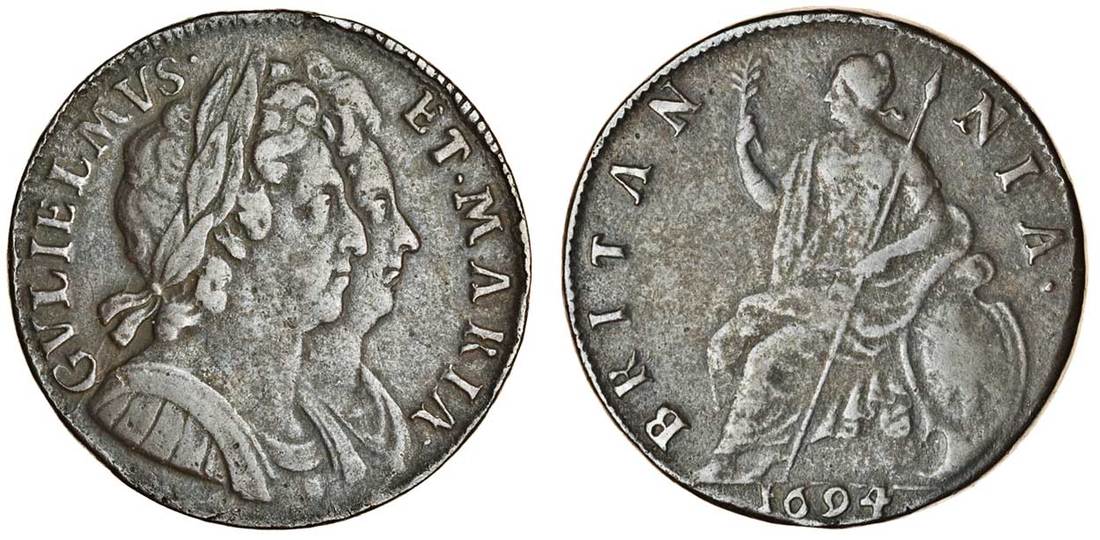 William and Mary (1688-94), Halfpenny, 1694, conjoined busts right, rev. Britannia seated left (Peck 602; S.3452), very fine