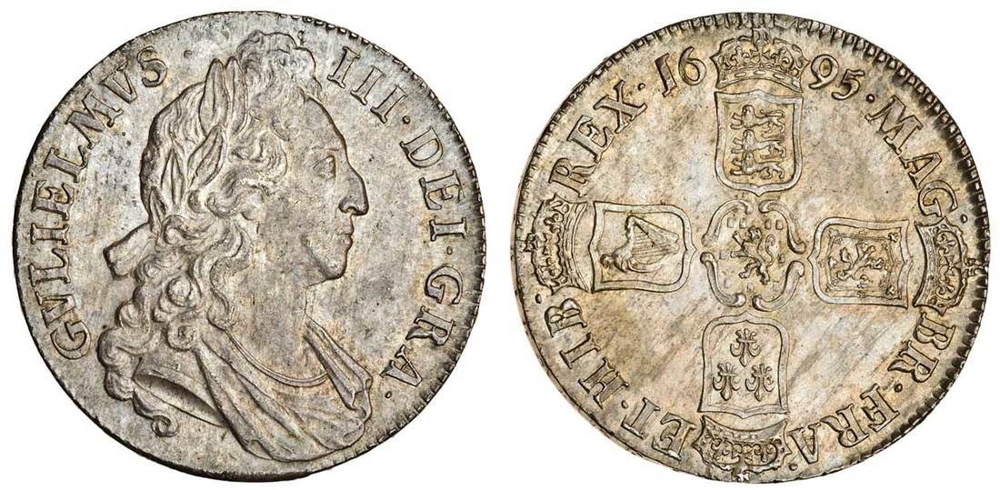 (x) William III (1694-1702), Crown, 1695 septimo, laureate and draped bust right, rev. four crowned shields cruciform, cinquefoils on edge (ESC 86; S.3470), some lustre under steel grey tone, good very fine