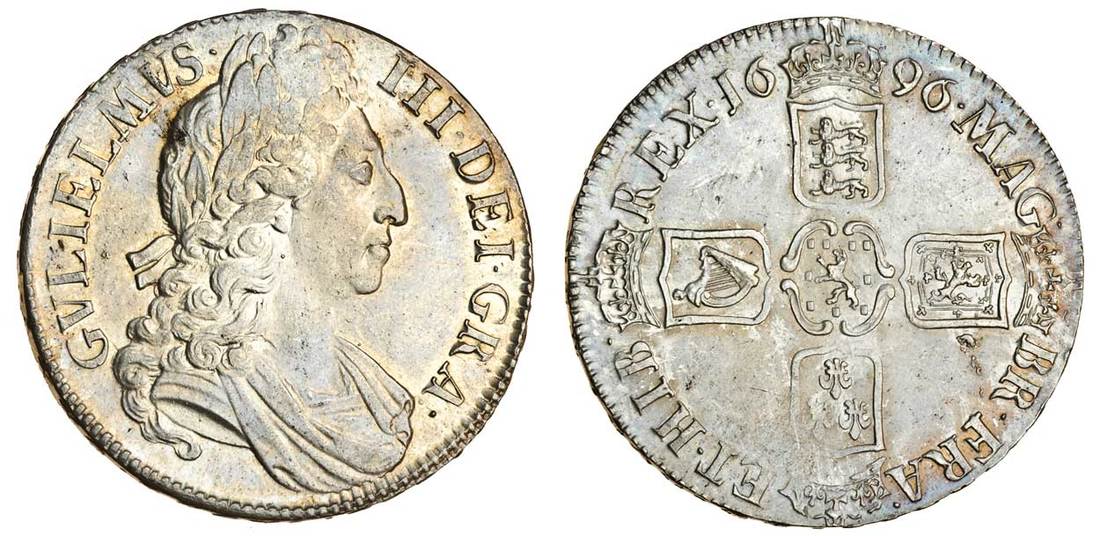 (x) William III (1694-1702), Crown, 1696 octavo, laureate and draped bust right, rev. four crowned shields cruciform (ESC 89; S.3470), cleaned, very fine