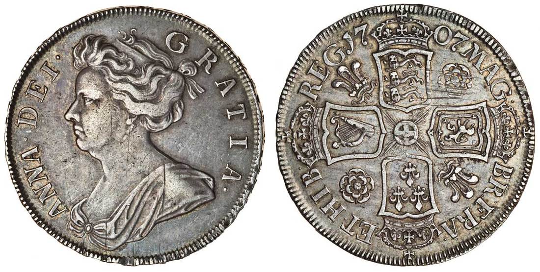 (x) Anne (1702-14), before Union, Halfcrown, 1707 sexto, draped bust left, rev. four crowned shields cruciform, roses and plumes in angels (ESC 573; S.3582), faint adjustment marks on obverse, grey tone, very fine