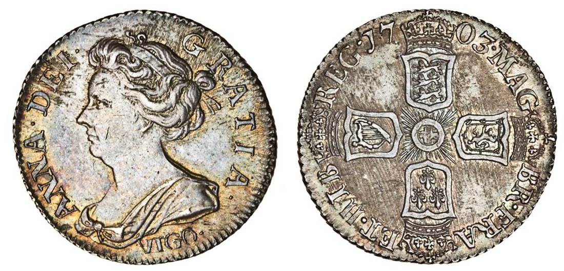 (x) Anne (1702-14), before Union, Sixpence, 1703, draped bust left, vigo below, rev. four crowned shields cruciform (ESC 1582; S.3590), some marks, lustre under old dark colour, nearly etremely fine