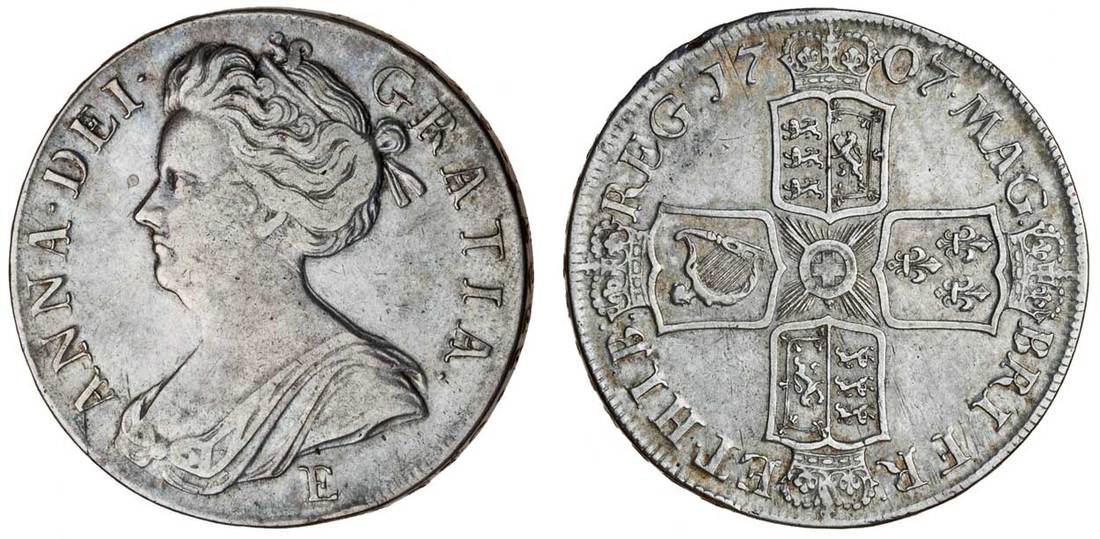 Anne (1702-14), before Union, Crown, 1707 E sexto, second draped bust left, letter E below, rev. crowned cruciform shields on plain field (S.3600), fine