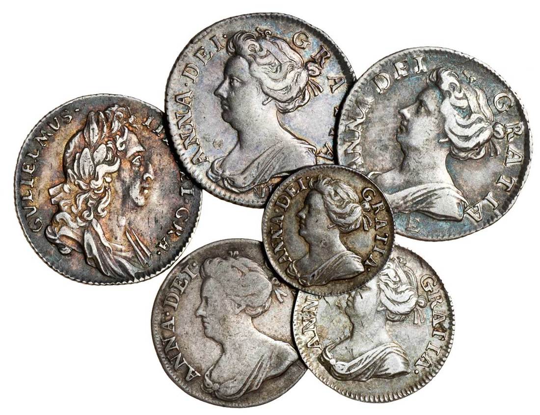 Anne (1702-14), Sixpence (2), 1707 vigo, 1707 E, Fourpence, 1709, Threepence, 1706, draped bust left, Twopence, 1710, William III, Sixpence, 1696 (S.3520, 3590, 3595A, 3596A, 3697A, 3620), fine to very fine (6)