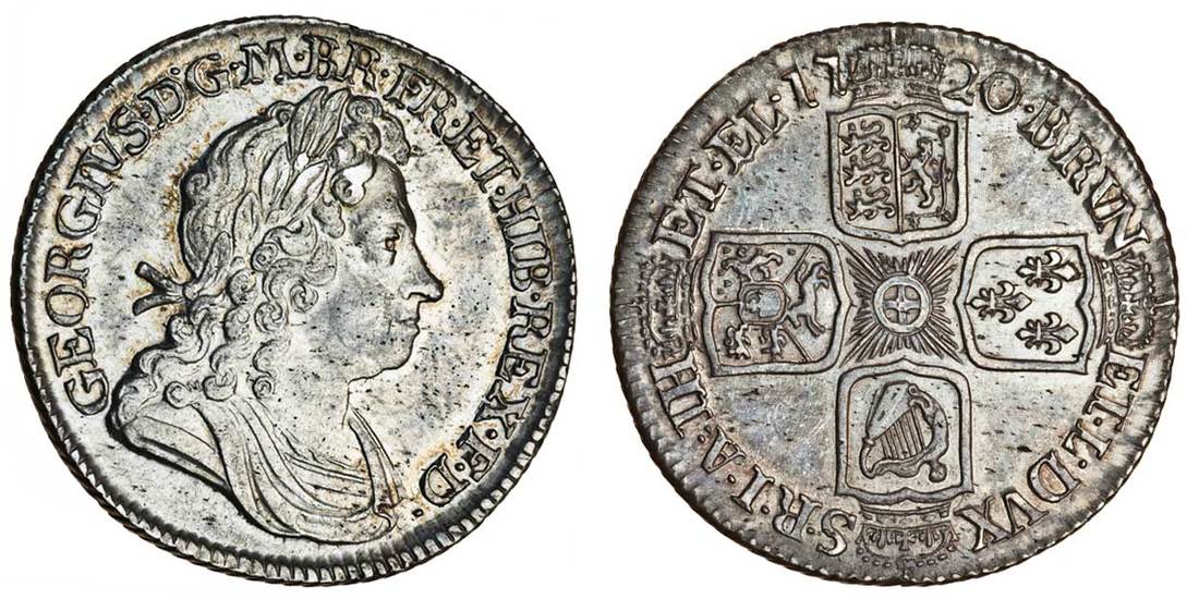 (x) George I (1714-27), Shilling, 1720 secvndo, laureate and draped bust right, rev. four crowned shields cruciform (ESC 1168; S.3646), good very fine