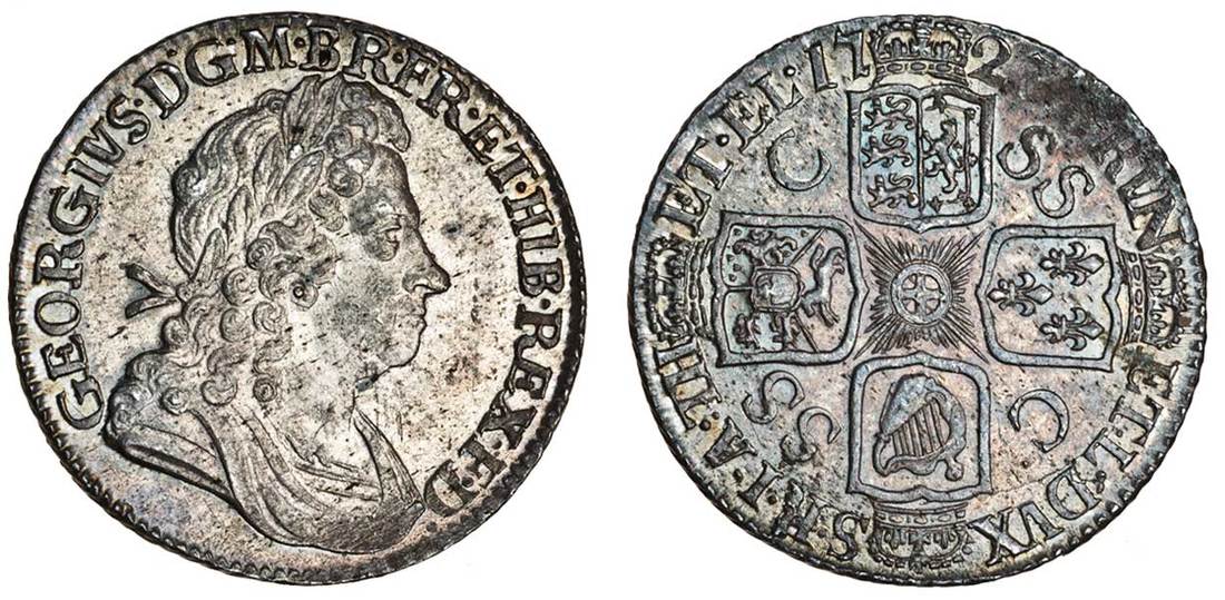 (x) George I (1714-27), Shilling, 1723, laureate and draped bust right, rev. four crowned shields cruciform, SSC in angles, one C over SS (ESC 1176A; S.3647), lustre, light grey tone, about extremely fine