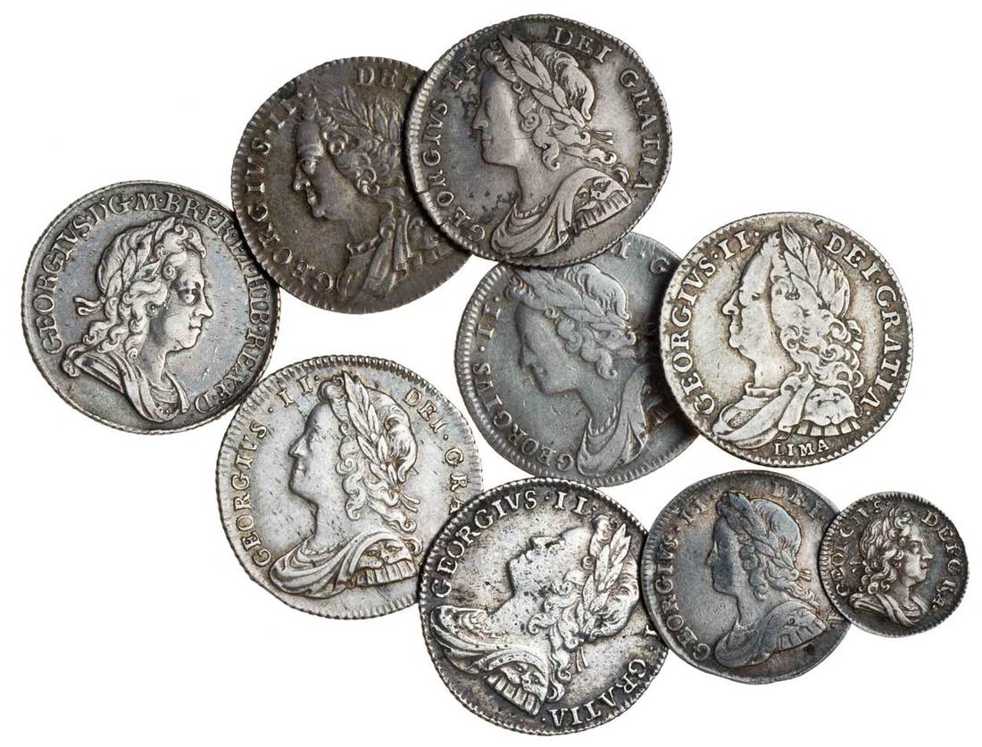 George I, Sixpence, 1723 ssc, Maundy Penny, 1720, George II, Sixpence (6), 1728, plumes in angles, 1728, 1736, roses and plumes, 1741, roses, 1746 lima, 1758, plain angles, Threepence, 1746 (S.3652, 3657, 3706, 3707, 3708, 3710, 3711, 3713B), about very fine to extremely fine (8)