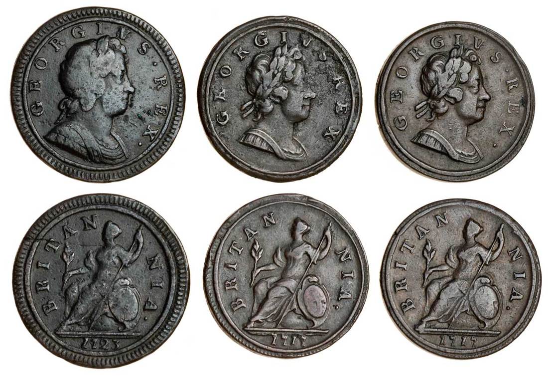 George I (1714-27), AE Halfpenny (3), 1717 (2), the second with no stops in obv. legend, 1723, struck on a thin flan (S.3659, 3660), the first very fine, the second good fine, the third fine and extremely rare (3)