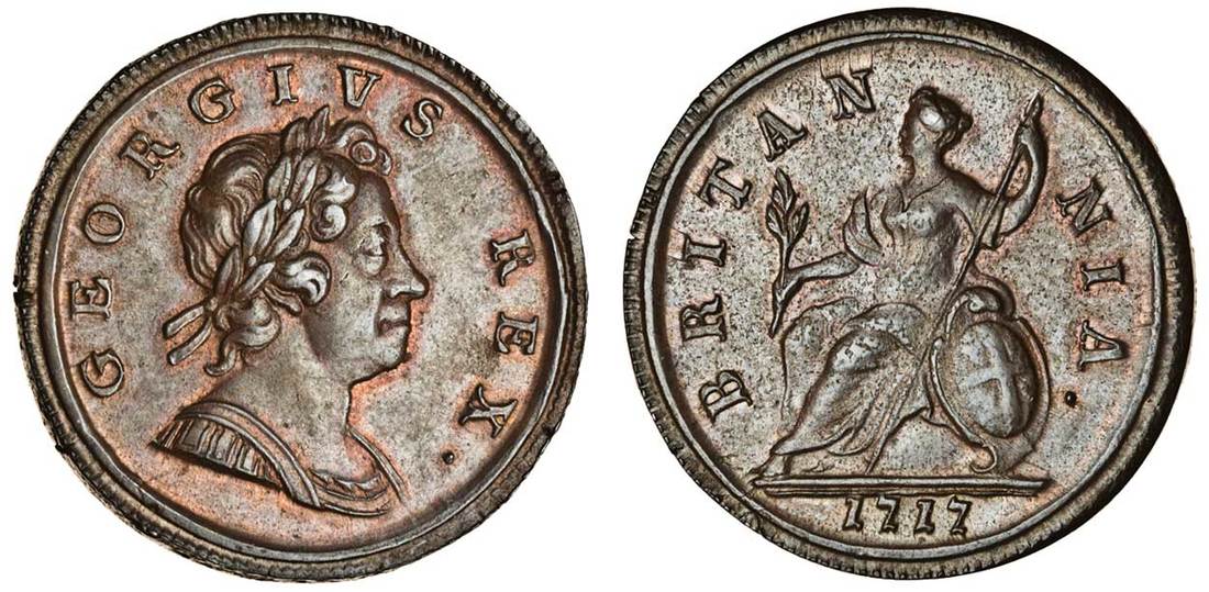 George I (1714-27), Halfpenny, 1717, 'dump' issue, laureate and cuirassed bust right, rev. Britannia seated left (Peck 768; S.3659), extremely fine, traces of lustre
