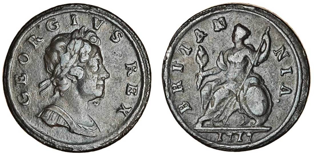 George I (1714-27), Halfpenny, 1717, 'dump' issue, laureate and cuirassed bust right, rev. Britannia seated left (Peck 768; S.3659), very fine