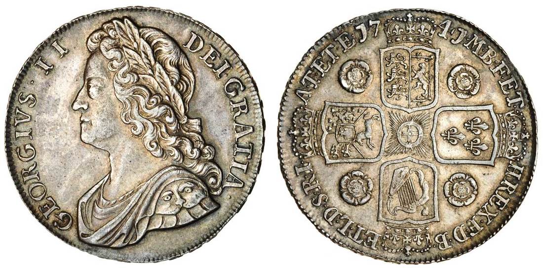 (x) George II (1727-60), Crown, 1741 decimo qvarto, young laureate and draped bust left, rev. four crowned shields cruciform, roses in angles (ESC 123; S.3687), light grey tone, some lustre, about extremely fine