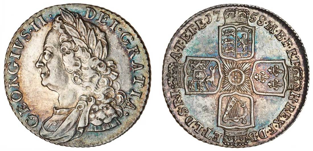 (x) George II (1727-60), Shilling, 1758, old laureate and draped bust left, rev. four crowned shields cruciform (ESC 1213; S.3704), grey tone, some lustre, nearly extremely fine